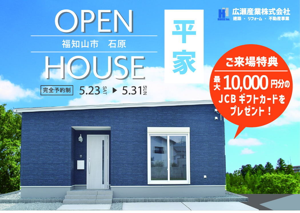 【5/23〜31】福知山市石原にて、青空に映えるブルーの平屋見学会を開催します!