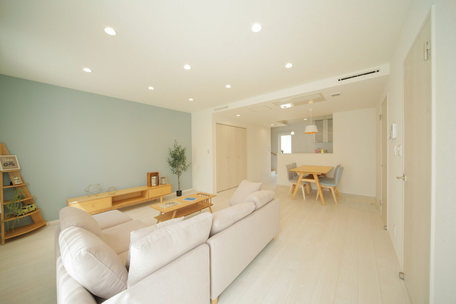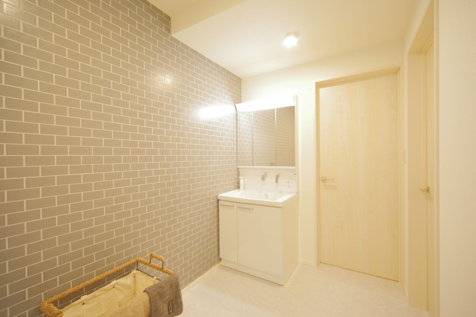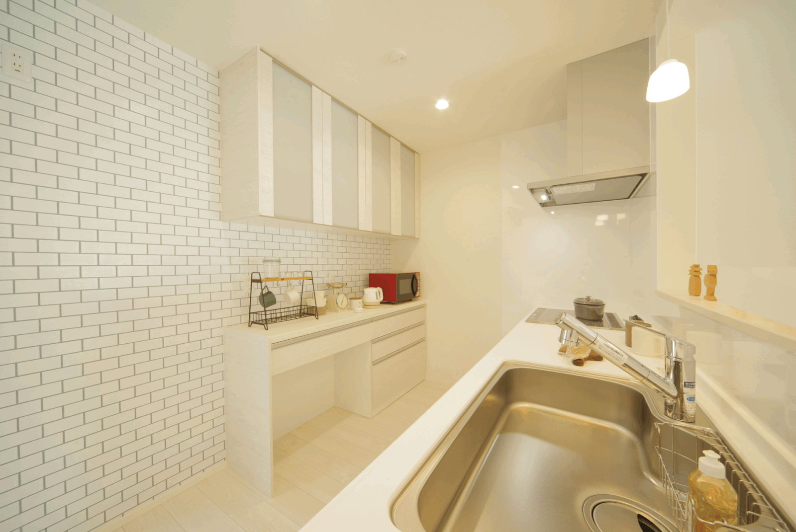 白を基調にブルーカラーやタイル柄を組み合わせて明るい雰囲気に。