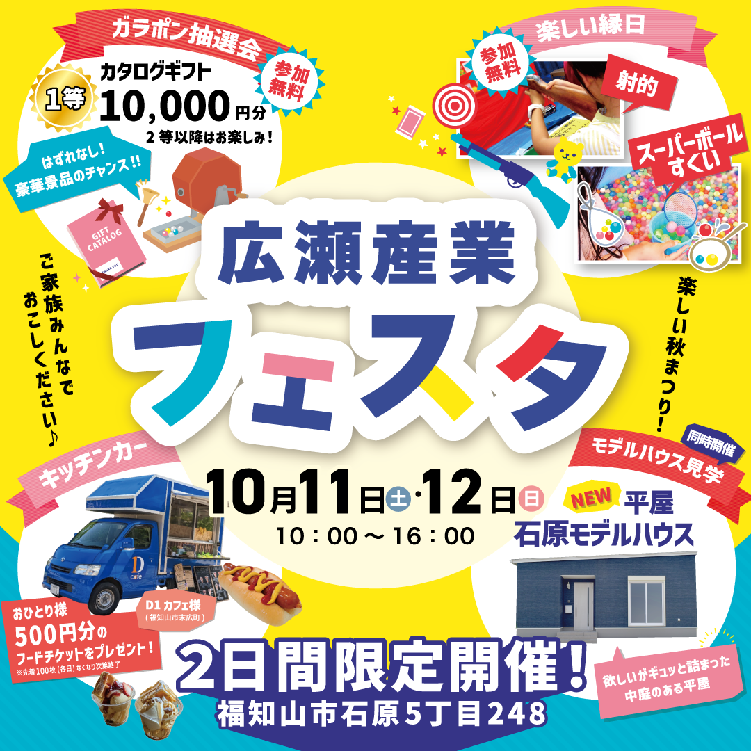 広瀬産業フェスタ開催決定!🎊 リフォーム新築 2025/9/28 10月11日・12日の2日間限定で”広瀬産業フェスタ”を開催いたします!! ガラポン抽選会や縁日コーナー、キッチンカー、最新モデルハウスの見学など 楽しいこと盛りだくさんのイベントとなっております👀 ご家族やご友人と一緒に遊びに来てください♪ 前へ ブログ一覧へ