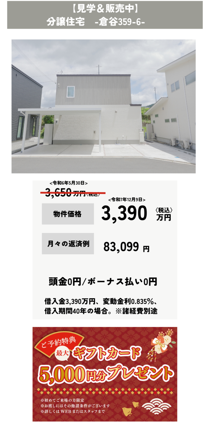 【舞鶴市倉谷】分譲住宅3,390万円 イベント 2026/1/5 今すぐ予約をする 今すぐ予約をする EVENT INFORMATION 日付 1月17日~1月31日 時間 10:00〜17:00(最終受付16時) 場所 京都府舞鶴市倉谷小字向ノ丁359-6 📍MAPを見る 今すぐ予約をする 来場特典 ギフト券5,000円分プレゼント! お菓子つかみ取り&抽選会 詳細・進呈条件はこちら + 【プレゼントお渡し&抽選会条件】 WEB予約ページから、ご来場日の前日までにご予約をお願いします 広瀬産業のイベントに初めてご来場の方 事前アンケートすべてご回答の方 事前審査提出の方 他社でご契約済みの方は対象外となります ご夫婦またはご家族でご来場の方 ご来場特典のお渡し抽選会参加にはその他諸条件がございます。詳しくはスタッフまで。 ✕ 閉じる 今すぐ予約をする 前へ イベント一覧へ 次へ