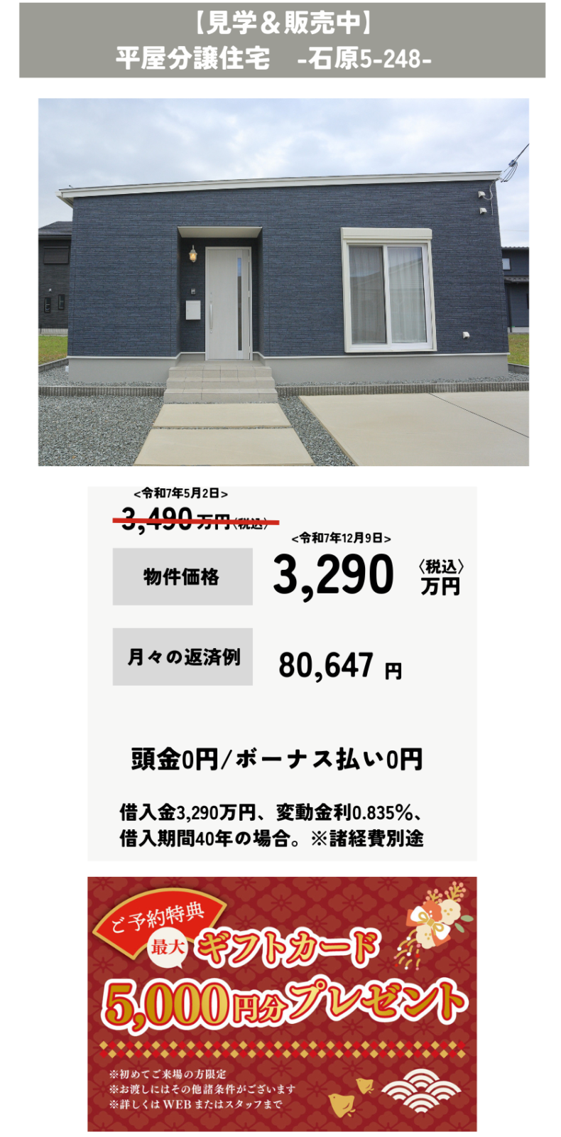 【石原】分譲住宅3,290万円 イベント新築 2026/1/5 今すぐ予約をする 今すぐ予約をする 今すぐ予約をする EVENT INFORMATION 日付 1月17日~1月31日 時間 10:00〜17:00(最終受付16時) 場所 京都府福知山市石原5丁目248 📍MAPを見る 今すぐ予約をする 来場特典 ギフト券5,000円分プレゼント! お菓子つかみ取り&抽選会 詳細・進呈条件はこちら + 【プレゼントお渡し&抽選会条件】 WEB予約ページから、ご来場日の前日までにご予約をお願いします 広瀬産業のイベントに初めてご来場の方 事前アンケートすべてご回答の方 事前審査提出の方 他社でご契約済みの方は対象外となります ご夫婦またはご家族でご来場の方 ご来場特典のお渡し抽選会参加にはその他諸条件がございます。詳しくはスタッフまで。 ✕ 閉じる 今すぐ予約をする 前へ お知らせ一覧へ
